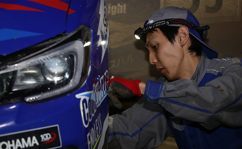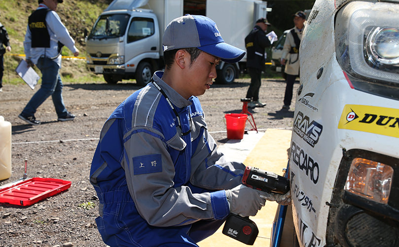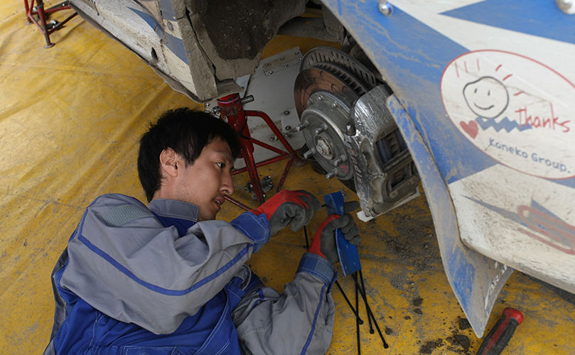 雨が降り出したラリー2日目、最後の45分のサービスでは足回りに不具合が見つかりチーム全体に緊張が走りました。私はリヤ下回り各部点検を担当したのですが、泥で工具がかけられず、焦りました。工具で泥をかき出して何とか作業を終えたときは残り時間3分。私にとっては一瞬で過ぎていった、濃密な45分間でした。